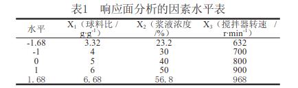 影響球磨機超微粉碎效果的主要因素有球料比、攪拌器轉(zhuǎn)速、枸杞子渣漿液濃度和粉碎介質(zhì)。因此本研究以上述3個因素作為試驗因素,固定球磨介質(zhì)為Φ10mm氧化鋯球,在單因素試驗的基礎(chǔ)上,通過響應(yīng)面分析化佳工藝參數(shù),以粉碎后的顆粒粒度d50作為超微粉碎評價效果。
