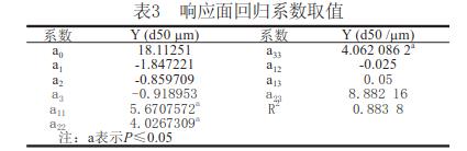 利用響應(yīng)面分析法[1]化枸杞子渣超微粉碎工藝參數(shù)。在單因素預(yù)試驗基礎(chǔ)上,用SAS軟件系統(tǒng)進行響應(yīng)面分析,設(shè)計一個三因素五水平的回歸方程來擬合因素和指標(響應(yīng)值)之間的函數(shù)關(guān)系。選擇球料比(X1)、枸杞子渣漿液濃度(X2)和攪拌器轉(zhuǎn)速(X3)作為因素,以粉碎后的顆粒粒度d50作為響應(yīng)值對球磨機濕法超微粉碎工藝進行化。